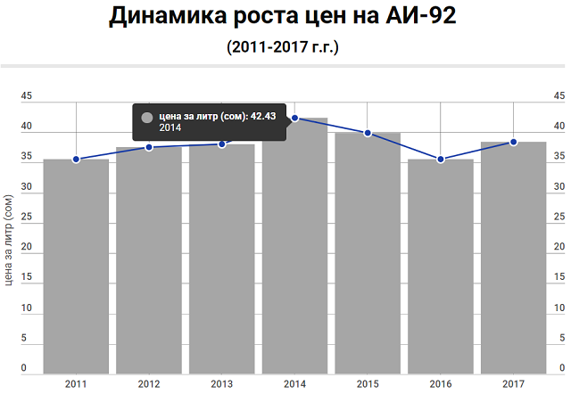 Самое дорогое топливо марки Аи-92 за последние шесть лет было в 2014 году — 42,43 сома за литр, а самое дешевое — в 2011-м — 35,57 сома. К слову, в 2016-м его стоимость практически приблизилась к минимальной отметке и составила 35,59 сома за литр.