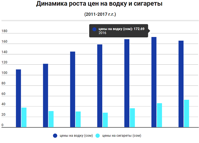 Интересно, как менялись цены на водку и сигареты. Еще в 2010 году литр сорокаградусной можно было купить за 60 сомов. Затем средняя цена на водку установилась на уровне 110,56 сома.