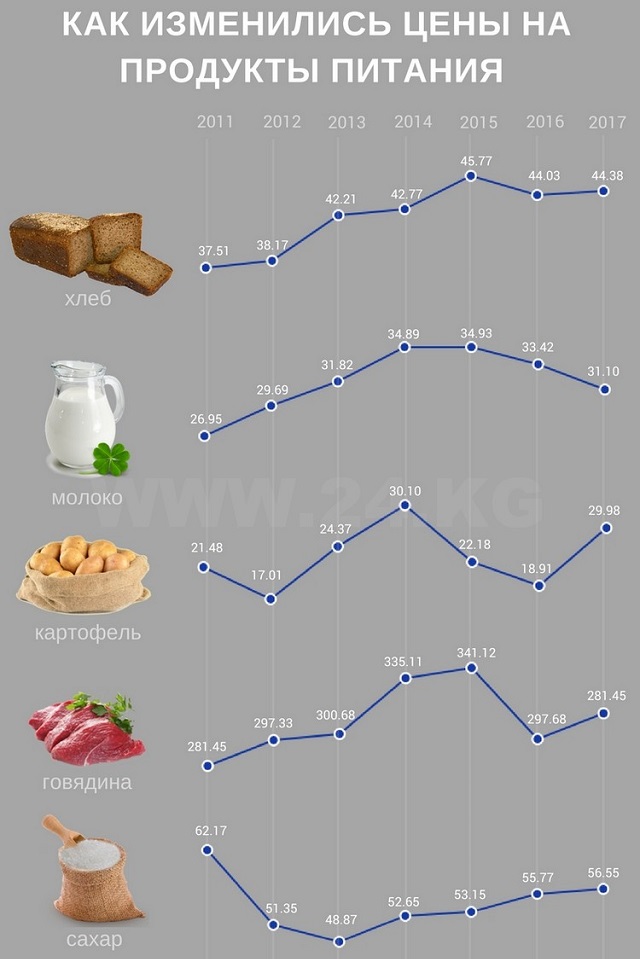 После вступления республики в Евразийский экономический союз подорожало разливное молоко. По итогам 2015 года оно стоило 34,93 сома за литр. В том же году подорожали говядина (на 6 сомов) и сахар (на 0,5 сома).