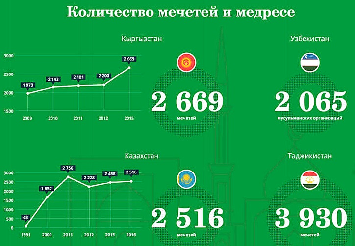 Показательны данные по количеству мечетей и имамов. Так, в Казахстане в 2016 году насчитывалось 2516 мечетей (в 1991 году — 68), в Кыргызстане — 2669 мечетей ( в 2009 году — 1973), в Таджикистане — 3930, в Узбекистане — 2065 мусульманских организаций. Больше всего имамов на душу населения в Таджикистане — 1 имам на 2210 человек (всего 3914 имамов), меньше всего в Узбекистане — 1 имам на 7824 человек (всего 4100 имамов). В Казахстане один имам приходится на 4915 человек (3611 имамов по стране), в Киргизии — на 2407 человек (2500 имамов).