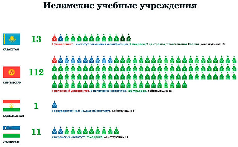 Ситуация с религиозным образованием в странах региона разнится. Так, в Кыргызстане зарегистрированы 112 исламских учебных заведений, в том числе один исламский университет, 9 исламских институтов, 102 медресе (из них 88 действующих). В пересчете на душу населения получается одно учебное заведение на 68,4 тысячи человек.