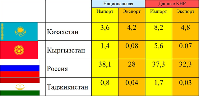 Это легко заметить, элементарно сопоставив статистику торговли с КНР принимающих государств и самого Китая (таблица 1).