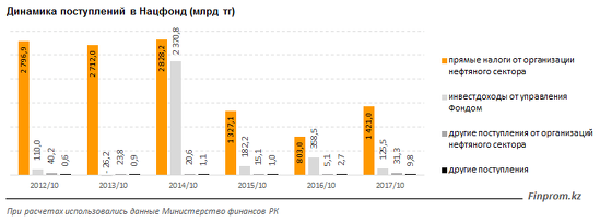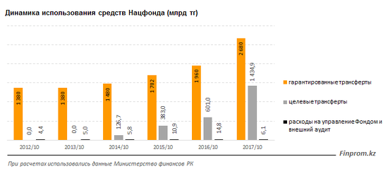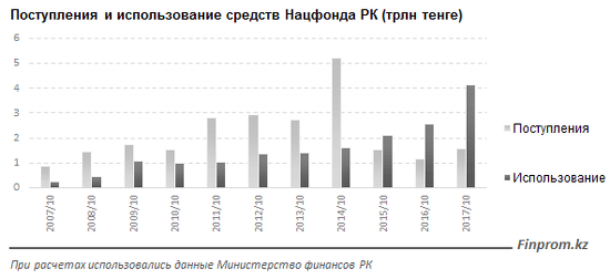 Уменьшение общего объема Нацфонда происходит на фоне резкого увеличения использования средств резерва по сравнению с более медленным ростом поступлений. В частности, в течение этого года всего из средств Нацфонда было использовано 4,1 трлн тенге против потраченных 2,6 трлн тенге за аналогичный период годом ранее. При этом объем поступлений с начала 2017 составил всего 1,6 трлн тенге.