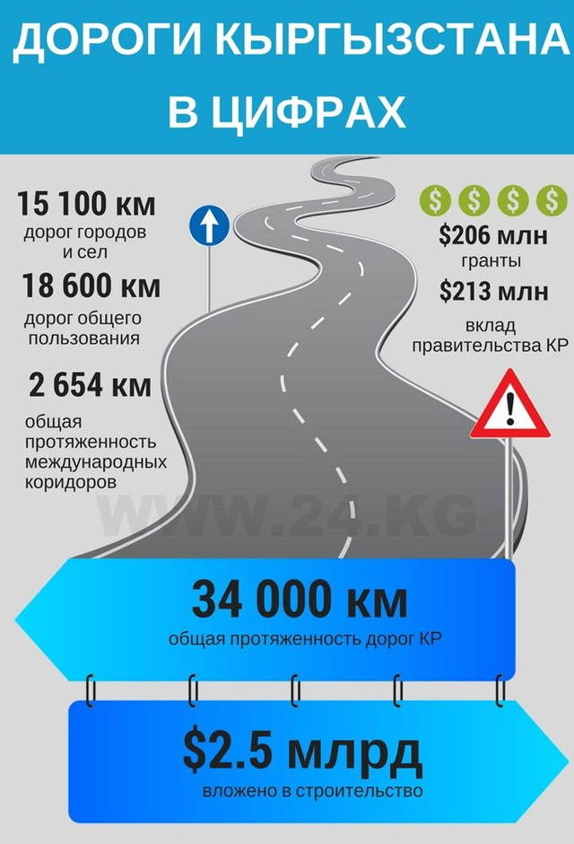 По информации Министерства транспорта и дорог, с 1996 по 2016 год на строительство трасс привлечено $2 миллиарда 521 миллион, из которых только $206 миллионов — гранты, $213 миллионов — софинансирование правительства КР.