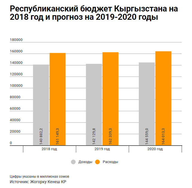 В 2018 году доходы с учетом грантов составят 140 миллиардов 882 миллиона сомов, или 26,2 процента к ВВП. Расходы составят 161 миллиард 149 миллионов сомов. Таким образом, дефицит составит 20 миллиардов 267 миллионов сомов. На покрытие недостатка направят средства из внешних и внутренних источников финансирования.