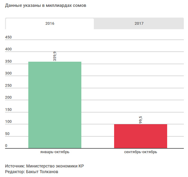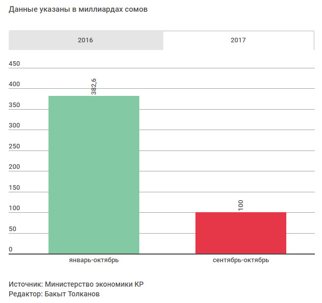 Одна из главных задач премьера-министра — развитие экономики. Приведем последние данные о внутреннем валовом продукте (на октябрь), согласно информации Минэкономики. Итак, за десять месяцев 2017-го объем ВВП составил 382,6 миллиарда сомов, тогда как за аналогичный период прошлого года было 359,9 миллиарда. Объем ВВП за сентябрь и октябрь был равен 100 миллиардам сомов, а год назад — 99,5 миллиарда.