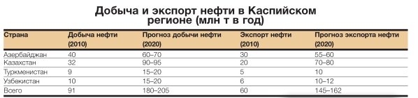 Итак, возможности ЦАР по нефти и газу уже сейчас делают регион значимым фактором мировой и особенно европейской энергетической политики: суммарные доказанные запасы нефти в странах Прикаспия (Казахстане, Азербайджане, Туркмении и Узбекистане) достигают 15 млрд т (около 2% мировых). При современном уровне годовой добычи нефти в регионе этих запасов хватит на 65 лет, а экспорт нефти уже к 2015 году мог бы составить 140–160 мл т в год. Подавляющая часть запасов нефти ЦАР сосредоточена в Казахстане, Туркменистане и Азербайджане. Добыча и производство нефти в регионе колеблется в пределах  80–90 млн т, потребление – на уровне 20 млн т нефти в год.