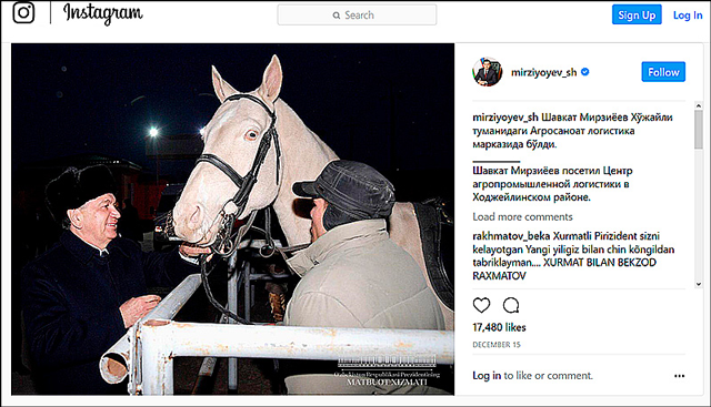 В Инстаграме мы нашли два подтвержденных аккаунта президента Узбекистана (он всерьез озаботился верификацией, у остальных президентов стран Центральной Азии в Инстаграме ее нет) – один англоязычный, второй – на русском и узбекском языках. 37,5 тысяч подписчиков в первом против 241 тысячи во втором. Один пост там, в среднем, набирает 15 тысяч лайков. Например, фото с удивленной лошадью лайкнули 17 тысяч человек.