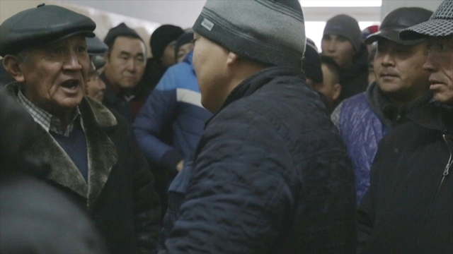 Строители трассы спорят с представителем компании «Лонг Хай» в ее иссык-кульском офисе 26 декабря 2017 года