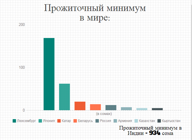 Наивысшие показатели у Беларуси — 14 тыс. 243 сома. Если рассматривать прожиточный минимум во всем мире, то цифры очень сильно разнятся. Так, в Люксембурге этот показатель составляет «астрономические» 169 тыс. сомов, а в Индии — всего 934 сома.