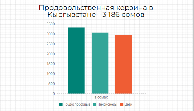 Но продовольственная корзина в Кыргызстане чуть выше — 3 тыс. 188 сомов против 2 тыс. 973 сомов у РК. В РФ показатель тоже невысок — 4 тыс. 606 сомов в пересчете на нацвалюту Кыргызстана.