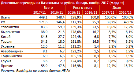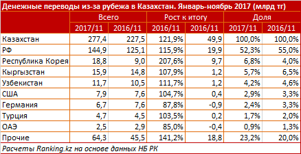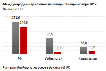 В ноябре 2017 года из Казахстана за рубеж с помощью систем денежных переводов было отправлено 50,4 миллиарда тенге, что на 2,9 процента (1,5 миллиарда тенге) меньше, чем в прошлом месяце. Получено из-за рубежа 27,5 миллиарда тенге, или на 3,1 процента (868,1 миллиона тенге) меньше, чем в октябре.