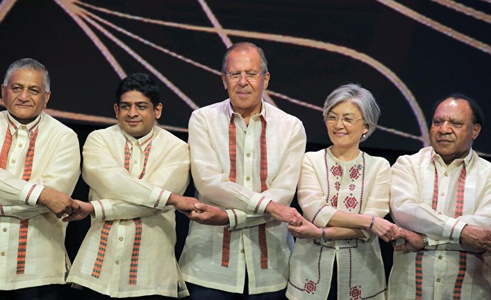 Министр иностранных дел РФ Сергей Лавров во время церемонии совместного фотографирования с министрами иностранных дел стран-участниц АСЕАН перед началом торжественного Галла-ужина на полях саммита в Маниле
