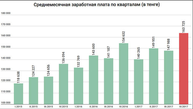 По данным Комитета по статистике, в 4 квартале 2017 года среднемесячная зарплата казахстанцев составила 163 725 тенге. Это на 10,6% (или на 15,7 тыс. тенге) больше, чем в июле-сентябре и на 5,9% (9 тыс. тенге) больше, чем в четвертом квартале 2016 года.