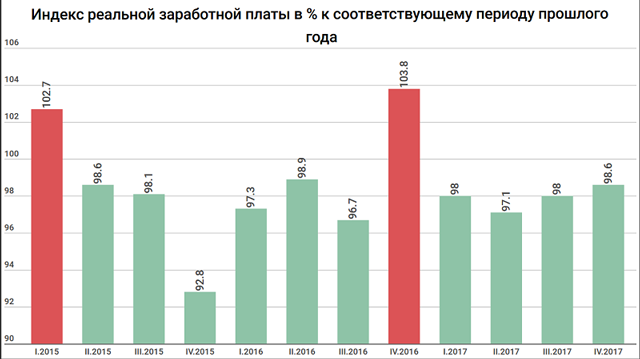 Если сравнивать кварталы, тут так же вырисовывается не самая радужная картина. Комитет по статистике перешел на подсчет параметров с периодичностью в три, а не один месяц с 2015 года. За это время индекс реальной зарплаты по сравнению с аналогичным периодом предыдущего года вырос лишь дважды: в январе-марте 2015 года и октябре-декабре 2016-го. Во все остальные отрезки времени платежеспособность казахстанцев оказывалась ниже, чем год назад.