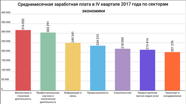 В списке секторов экономики с наибольшими зарплатами произошли изменения. По итогам IV квартала больше всего стали зарабатывать сотрудники, занятые в финансовой и страховой деятельности – в среднем более 316 тыс. тенге в месяц, что на 5,2 тыс. больше, чем в октябре-декабре 2016 года. Прежний лидер – профессиональная, научная и техническая деятельность – заметно сдал позиции: оплата труда за год снизилась на 24 тыс. тенге — до 303,3 тыс. тенге в месяц.