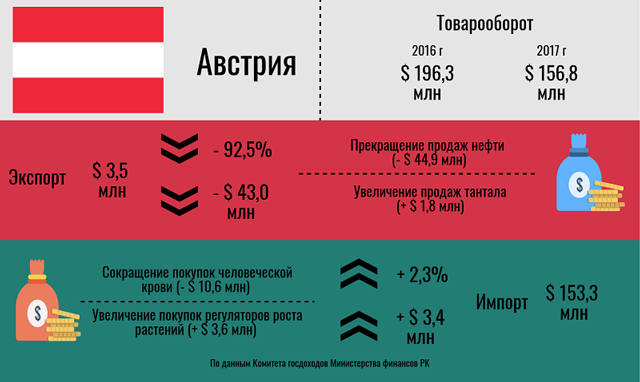 Сократился и импорт главного ввозимого из Австрии товара – человеческой крови: объем сделок упал с 26,9 до 16,3 млн долларов. Однако несмотря на это общий объем импорта несколько вырос (на 2,3%), что произошло благодаря общей диверсификации поставок и увеличению спроса в Казахстане на регуляторы роста растений из этой европейской страны.