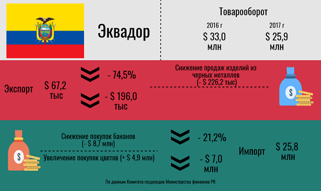 Главным товаром, на котором долгое время базировались торговые отношения Казахстана и Эквадора, являются бананы. В 2016 году объем импорта составил 17,1 млн долларов, но на следующий год он снизился более чем в 2 раза – до 8,5 млн долларов. Это отразилось на общем снижении и без того небольшого товарооборота. Впрочем, Эквадор выходит на казахстанский рынок с новым товаром – цветами.