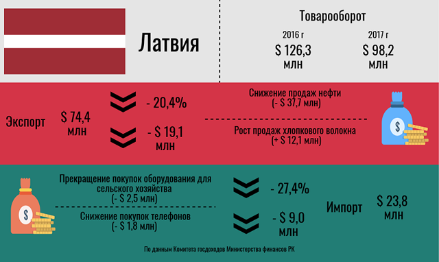 Пока Казахстан стремительно увеличивает показатели торговли с Литвой, объем сделок с ее соседями уменьшается. Большое влияние тут оказывает нефть: объем экспорта в Латвию снизился в 2017 году на 37,7 млн долларов (продажи в Литву за это время выросли на 329,1 млн долларов). Впрочем, главным товаром на продажу является не нефть, а хлопковое волокно: в 2016 году прибалтийская республика заплатила за казахстанское сырье 38,5 млн долларов, год спустя – 50,6 млн, что составило 2/3 от всего экспорта.