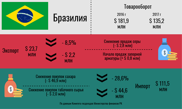 Товарооборот с Бразилией во многом завязан на импорте – он составляет более 80% от общего объема сделок. Основной товар – это сахарный тростник: в 2016 году его было завезено на 136,2 млн долларов. Но в 2017 году Казахстан переключился на российский тростник, в результате чего объем закупок из Бразилии уменьшился почти на треть (- 47,9 млн долларов). Снизился и экспорт, чему в немалой степени поспособствовало снижение спроса на серу: объем продаж снизился с 25,4 до 22,6 млн долларов.