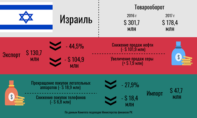 Кроме того, Казахстан перестал покупать в Израиле летательные аппараты, что в 2016 году было главным импортируемым товаром (-18,9 млн долларов), а также снизил покупки сотовых телефонов с 12,8 до 5,9 млн долларов.