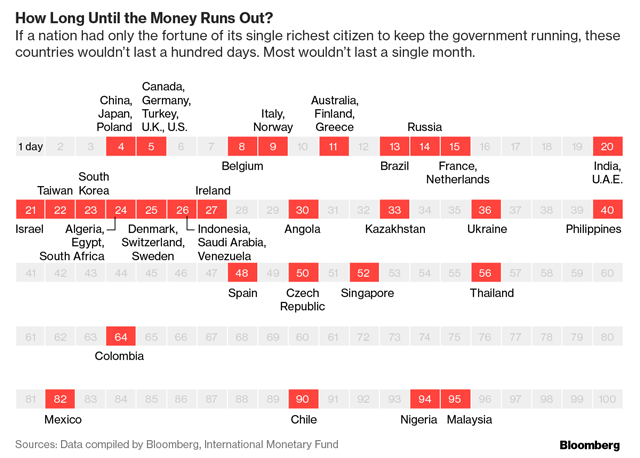 Издание подсчитало, сколько дней правительства разных стран могли функционировать, если все их расходы покрывались за счет богатейшего гражданина этой страны.