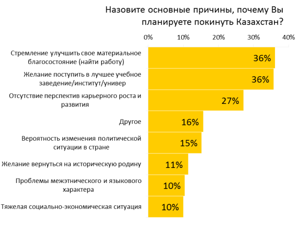 Факт 4. Среди молодежи достаточно сильны миграционные настроения. Как показало исследование, достаточно большое количество молодых казахстанцев(около 41%) задумывается о переезде из Казахстана либо насовсем, либо чтобы получить за рубежом более качественное образование. Основные причины таких настроений больше экономические. Большая часть едут за лучшей работой, перспективами в карьере. При этом активность желания покинуть Казахстан различна по регионам. Так, в северных регионах желание покинуть страну выше. А среди казахской молодежи желание уехать из Казахстана, наоборот, ниже.