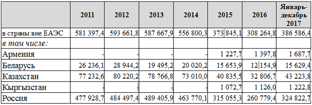 За январь-декабрь 2017 года экспорт государств-членов ЕАЭС в третьи страны по сравнению с аналогичным периодом 2016 года вырос на 20,4%, или на $78,3 млрд.