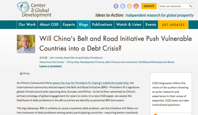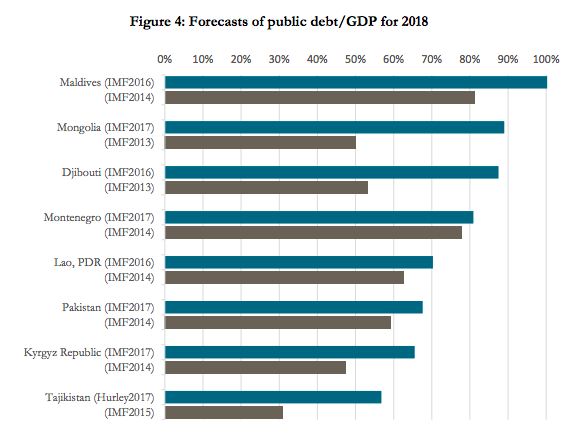 В своем докладе аналитики CGD оценили вероятность долговых проблем в 68 странах, которые являются заемщиками Китая в рамках BRI, и «особую озабоченность» аналитики высказали в отношении Джибути, Лаоса, Мальдив, Монголии, Черногории, Пакистана, Таджикистана и Кыргызстана, которые, по их мнению, могут пострадать от чрезмерного долгового бремени, взятого на себя в рамках программы Китая…».