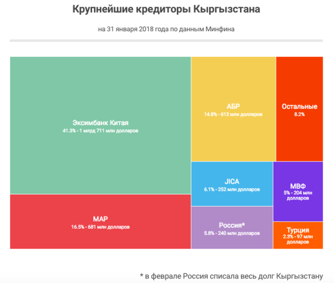 Ниже приводим инфографику, подготовленную кыргызскими журналистами радио «Азаттык» на основе более свежих данных о внешнем долге Кыргызстана. Согласно цифрам Минфина, на 31 января 2018 года КР задолжала китайскому Экспортно-импортному банку уже 1 млрд 711 млн долларов или 41% от общей суммы внешнего долга, который составляет 4 млрд 139 млн долларов.
