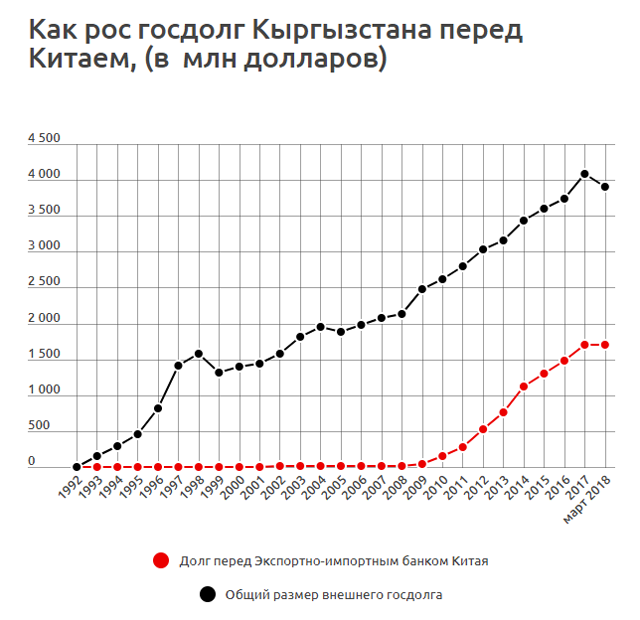 На конец марта этого года государственный внешний долг Кыргызстана перед Китаем (Эксимбанк КНР) составил 1 миллиард 709 миллионов долларов. Как выяснилось, за последние 10 лет долг перед Поднебесной увеличился почти в 200 раз. В том числе 386 миллионов долларов было взято на модернизацию столичной ТЭЦ. При этом вернуть стране надо почти полмиллиарда долларов.