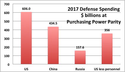 Какую бы методологию мы не использовали, российские расходы на оборону составляют только часть американских, хотя эта часть резко увеличивается, с 11 процентов (по рыночному курсу валют) до 26 процентов (по ППС) общих американских расходов на оборону, и до 44 процентов американских расходов за минусом выплат и льгот военному персоналу. При этом китайские расходы на оборону увеличиваются с 38 процентов общих американских ( по рыночному курсу валют) до 71 процента (по ППС) и до 122 процентов американских расходов за минусом выплат и льгот военному персоналу.