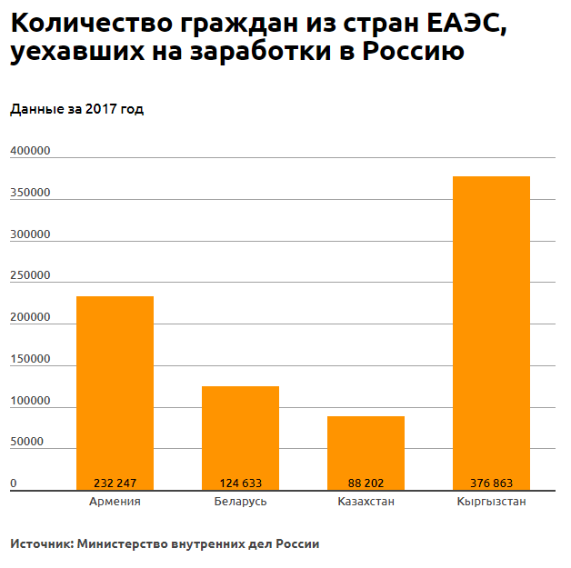 Кыргызстан лидирует среди стран Евразийского экономического союза по числу граждан, уехавших на заработки в РФ. На втором месте — Армения (в 2017 году — 232 247 человек), далее идут Беларусь (124 633) и Казахстан (88 202).