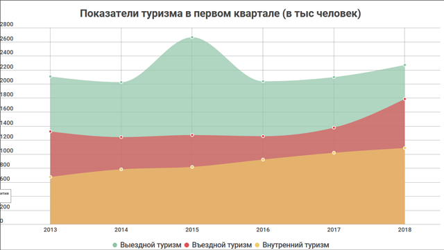 В 1 квартале 2018 года показатели выездного туризма составили 2 млн 270,6 тыс. человек (+175,1 тыс. по сравнению с аналогичным периодом 2017), что является максимальным показателем за последние 3 года.