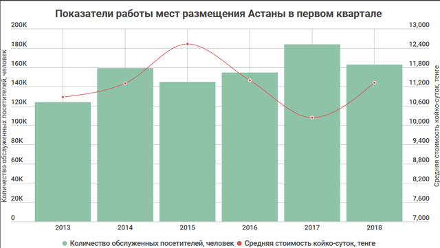 средняя стоимость койко-места в местах размещения Астаны в 1 квартале составила 11 318 тенге – на 1085 тенге больше, чем в 2017