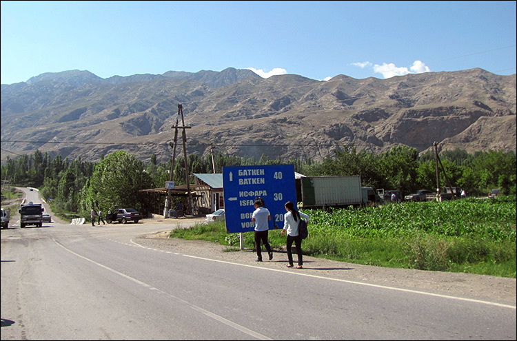 Мы приехали на окраину автовокзала таджикского города Исфары, где останавливаются киргизские водители. Они занимаются перевозкой граждан по маршруту Исфара (Таджикистан) — Баткен (Кыргызстан) и обратно. Один из киргизских таксистов пообещал за 25 сомони ($3) довести нас до гостиницы, которая расположена в Баткене. Буквально за 15 минут мы доехали до КПП «Гулистон» Исфаринского района.