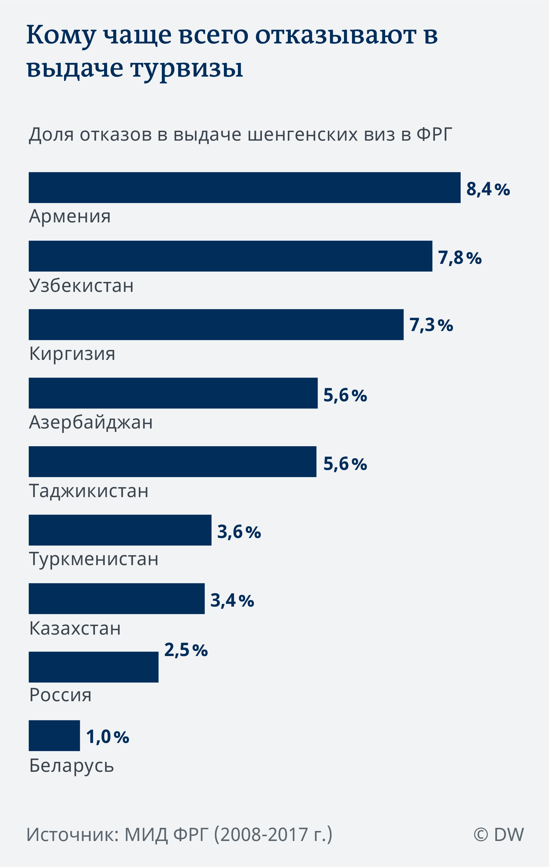 В другом конце списка находится Армения: здесь турвизы отказываются выдавать в более чем 8 процентах случаев. Похожим образом дела обстоят и в соседнем Азербайджане, а также странах Центральной Азии - Узбекистане и Киргизии. При этом стоит отметить, что за последнее десятилетие статистика отказов в шенгенской визе здесь практически не изменилась.