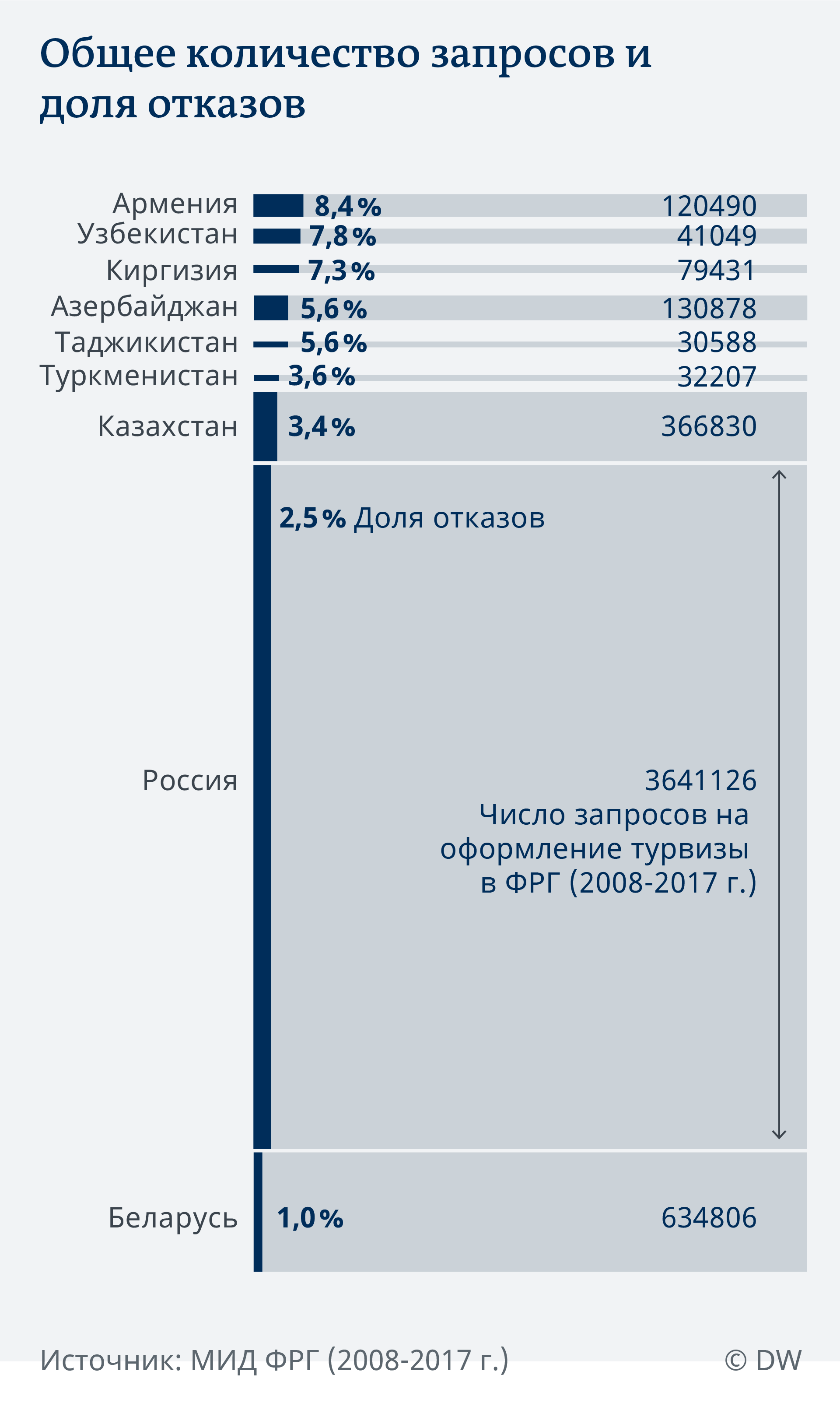 Гражданам России и Беларуси легче оформить туристическую шенгенскую визу в Германию, чем жителям стран Центральной Азии - к примеру, Узбекистана или Киргизии, свидетельствуют данные МИД ФРГ. Журналисты DW проанализировали статистику и выяснили, граждане каких постсоветских стран активнее всего подают запросы на оформление шенгенской визы в Германию и кто из них имеет наибольшие шансы ее получить.