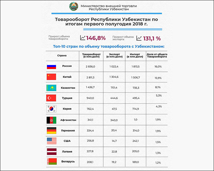 Товарооборот Узбекистана с другими странами с января по июнь 2018 года составил $17 млрд 685 млн, что на $5 млрд 641 млн больше, чем за аналогичный период 2017 года. В тройку лидеров с миллиардным оборотом входят Россия, Китай и Казахстан, сообщает «Kommersant.Uz» со ссылкой на данные Министерства внешней торговли республики.