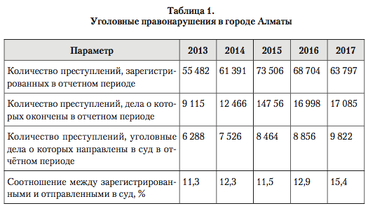 Посмотрите на таблицу (Табл. 1) с ситуацией по городу Алматы: в прошлом году было совершено 64 тысячи преступлений, из них расследовали только 17 тысяч, в суд отправлены 10 тысяч. Это разве работа?