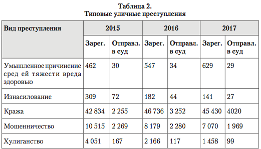А вот составленная мной таблица типовых уличных преступлений (Табл. 2), наиболее опасных именно для граждан. До суда дошли лишь 1 из 5 изнасилований, 1 из 31 случаев избиения, 1 из 11 краж, 2 из 7 случаев мошенничества, 1 из 15 проявлений хулиганства. Люди боятся стать жертвами, а преступники чувствуют себя безнаказанными. И чтобы полицейским доверяли, надо эту статистику изменить.
