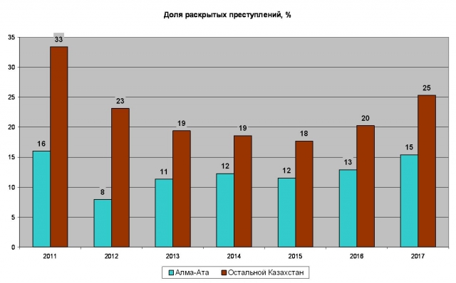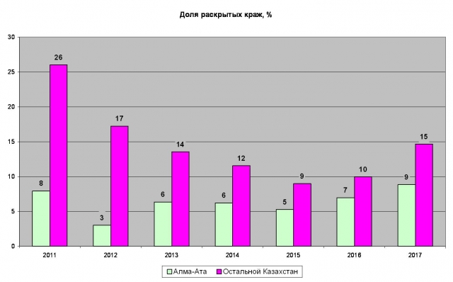 По общей раскрываемости преступлений в Алма-Ате ситуация хуже в 1,5−3 раза, а если говорить о кражах, то разница вырастает до 1,5−6 раз. Особенно впечатляют данные за 2012 год, когда было раскрыто всего 3% совершенных краж.