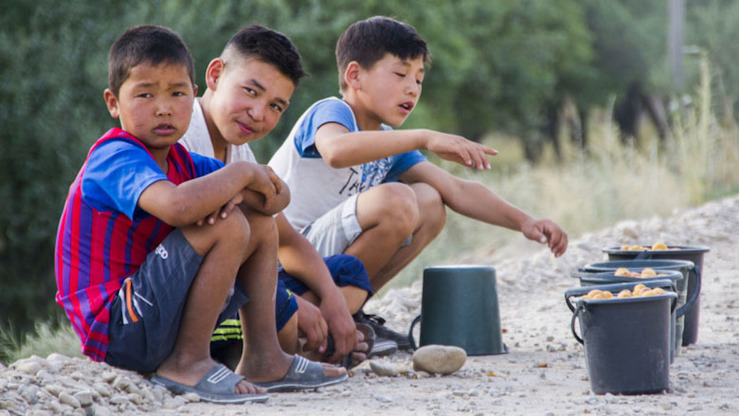 Во время летних каникул школьники из Баткенской области Кыргызстана зарабатывают на карманные расходы, продавая абрикосы водителям проезжающих грузовиков. [Группа Всемирного банка]