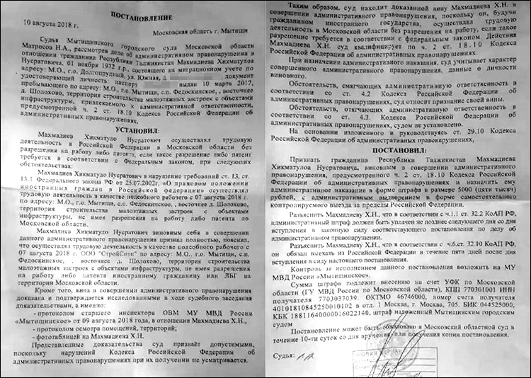 Бумаги были подписаны судьей Мытищинского городского суда Николаем Александровичем Матросовым. Самое возмутительное в этой истории, что никто из мигрантов судью не видел, на суд их не возили, а все решения были вынесены заочно, что считается прямым нарушением законов.