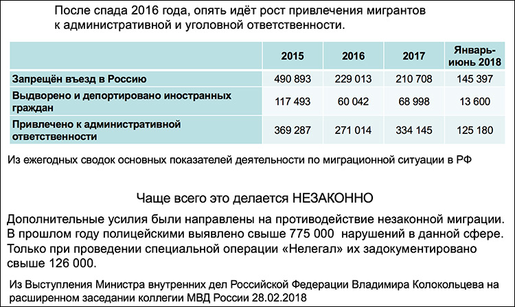 - Затем пошла репрессивная волна в отношении мигрантов, которых наказывали за проживание не по месту регистрации или за занятость не по профессии, указанной в патенте. Самая частая причина депортации в 2018 году - у человека во время проверки при себе не оказалось документов. Еще в 2016 году мы выиграли дело в Верховном суде, было установлено, что отсутствие документов в кармане не является доказательством отсутствия документов вообще, и человека достаточно проверить по базе и отпустить. Однако людей продолжают выдворять именно по этой причине.