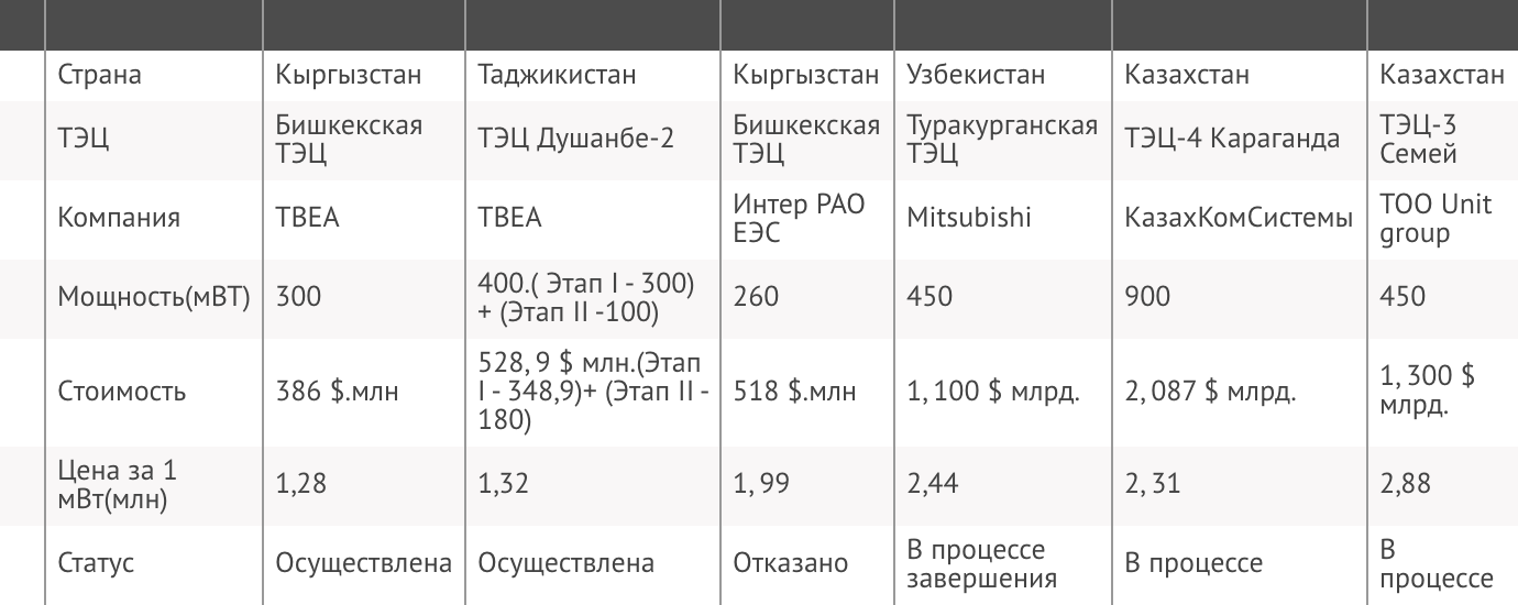 Стоимость за реконструкцию теплоэлектроцентрали мощностью в 300 мегаватт (МВт) являлась среднемировой. TBEA не просто модернизировала теплоэлектроцентраль, а по сути строила новую ТЭЦ на территории уже имеющейся. В таблице ниже приведена стоимость за 1 МВт ТЭЦ в построенных в СНГ за последние 10 лет: