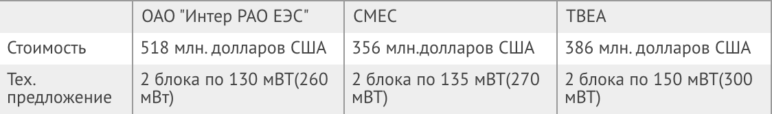 Поступили также два предложения от китайских компаний TBEA и CMEC. TBEA предлагала построить два блока по 150 мегаватт (в сумме 300 МВт), а CMEC – два блока по 135 мегаватт (в сумме 270 МВт). При этом TBEA сразу заявила о том, что финансирование реконструкции будет через ЭКСИМбанк Китая, которому будут предоставлены гарантии китайского правительства. То есть это было предложение, в котором был уже и источник финансирования.