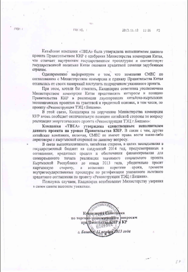 А тогда осенью 2013 года мы обратились к китайской стороне за соответствующими разъяснениями. И 11 ноября 2013 года МИД КР получили ответ из канцелярии советника по торгово-экономическим вопросам при Посольстве КНР в КР.