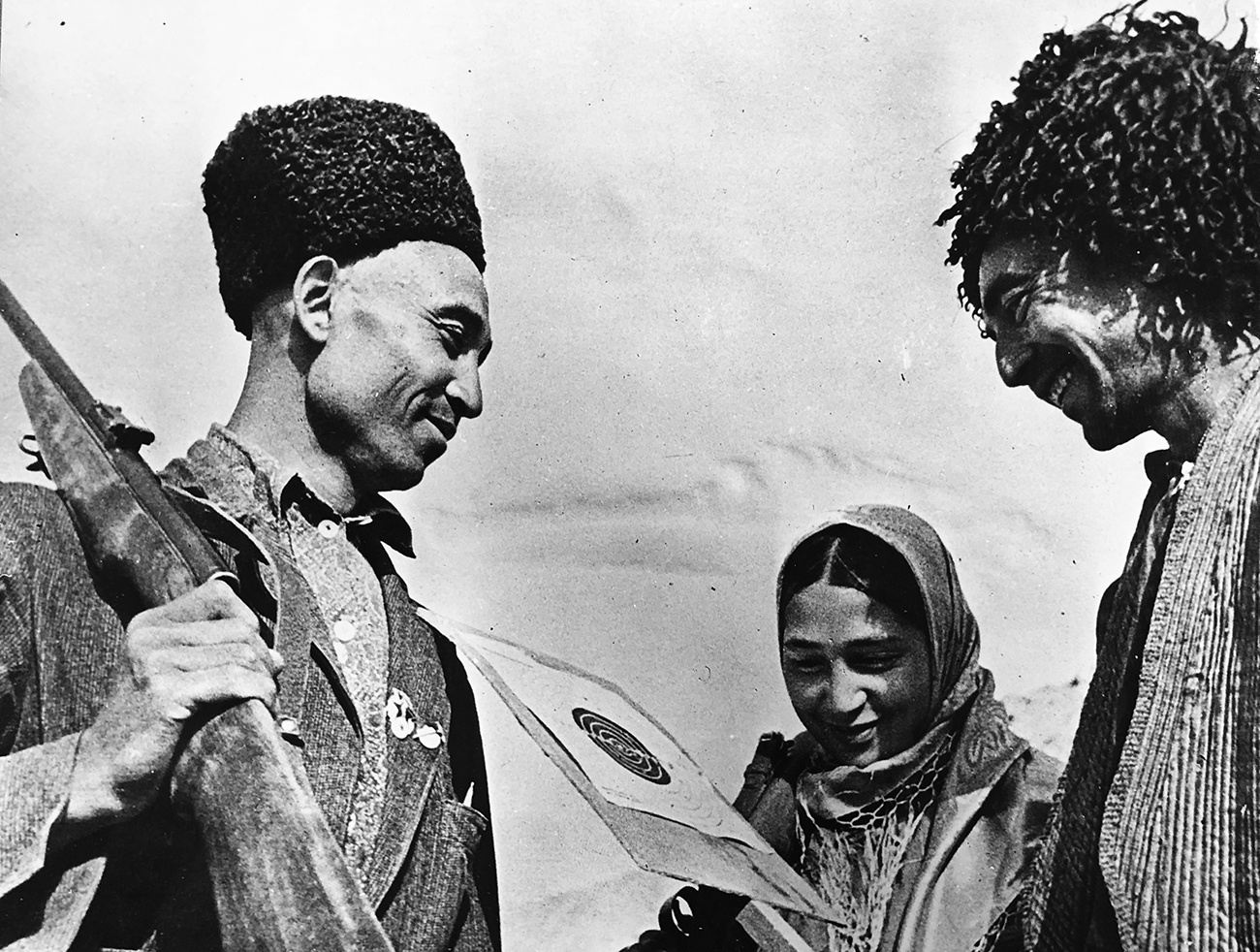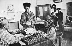 Члены стрелкового кружка считают набранные очки. Советский Туркменистан, 1930-е годы. (Библиотека Конгресса)