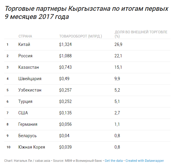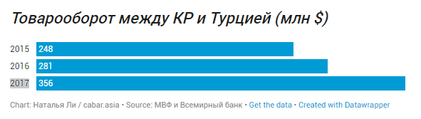 Однако и экономические отношения имеют место быть. Согласно данным МВФ и Всемирного банка, по итогам 9 месяцев прошлого года, Турция вошла в десятку главных торговых партнеров Кыргызстана. Товарооборот между двумя странами составил более 250 миллионов долларов.